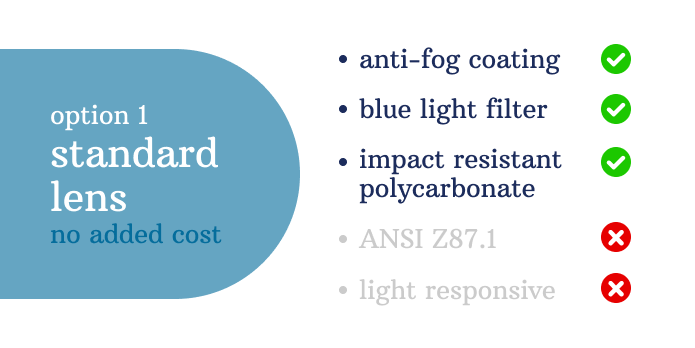 표준 렌즈 : 일상적인 사용에 가장 적합한 옵션입니다. 김서림 방지 코팅으로 렌즈가 흐려지지 않도록합니다. 청색광 필터는 청색광의 40 %를 차단하여 화면에서 눈의 피로를 줄입니다.