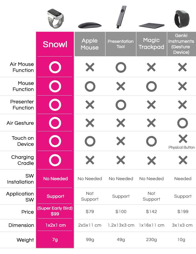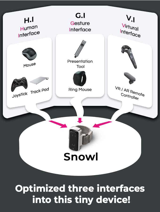 Snowl은 휴먼 인터페이스용 마우스 및 터치 패드 기능을 갖추고 있으며 제스처 인터페이스를 통한 프레젠테이션에 유용하며 가상 인터페이스를 통해 VR 컨트롤러 역할을합니다. 이러한 모든 인터페이스는 하나의 작은 장치로 결합됩니다.