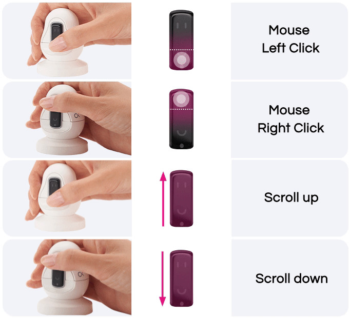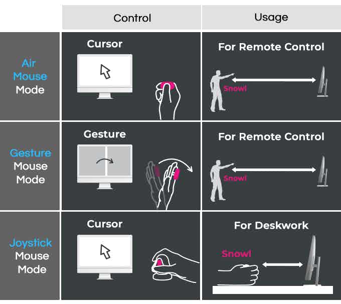 Snowl 링을 충전 거치대 안에 넣으면 조이스틱 마우스로 사용할 수 있으며 기존 마우스와 동일한 기능을 수행 할 수 있습니다.