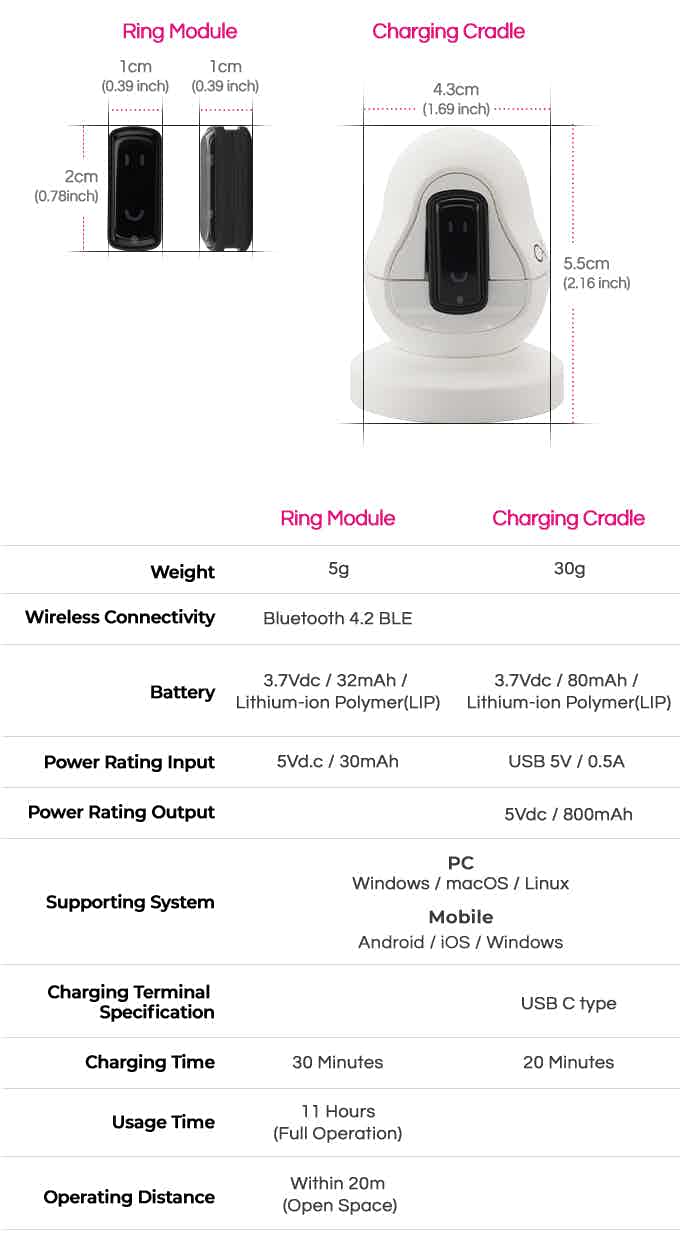 손 움직임의 자연스러운 제스처를 유기적으로 학습하고 손가락 제스처를 추적합니다. 기존 마우스를 대체하는 동시에 태블릿 컴퓨터, 스마트 폰, 스마트 TV 등 다양한 장치를 쉽게 제어 할 수 있습니다. 그리고 반지처럼 착용하기 때문에 다양한 동작을 할 수 있습니다.