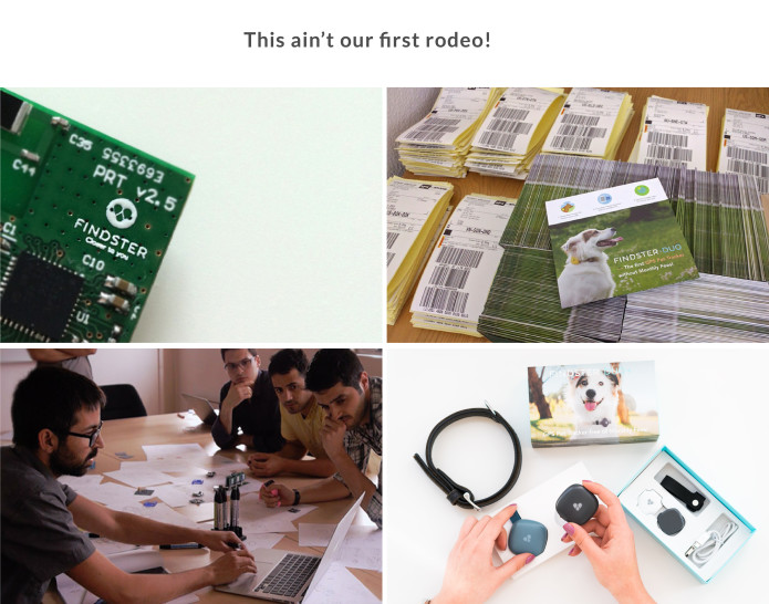 우리는 2014 년부터 Findster를 개발하고 있습니다. 실제로 월 사용료가없는 최초의 GPS Pet Tracker 인 Findster Duo의 이전 캠페인에서 Findster 이름을 기억할 수 있습니다. 그것은 3 년 전이었습니다.이 캠페인은 50 개국 이상에서 온 1700 명의 후원자들에 의해 성공적으로 자금을 지원 받았으며 우리는 제품을 개발, 제조 및 제공했습니다. 우리는 지속적으로 후원자의 피드백을 듣고 모듈과 앱 모두에 대한 업데이트를 정기적으로 제공했습니다.